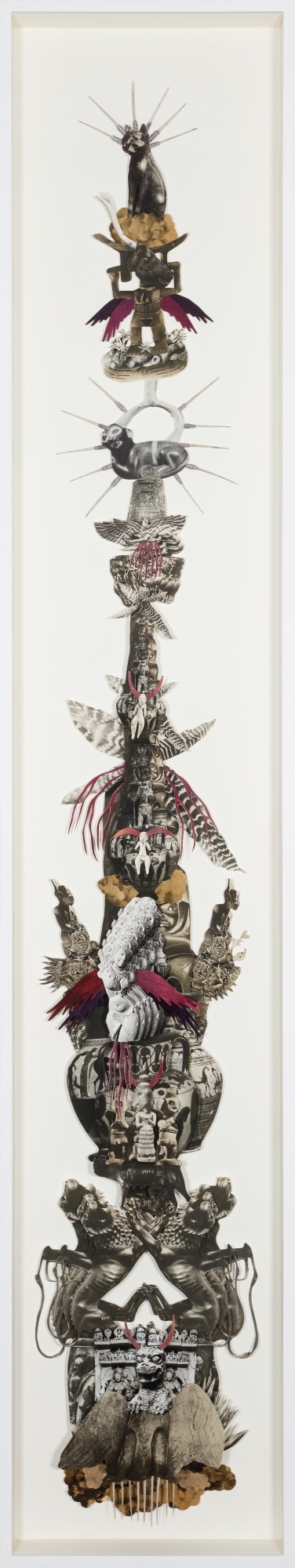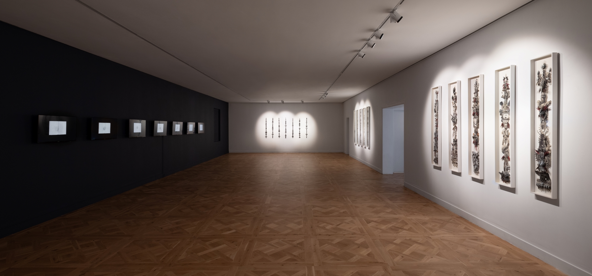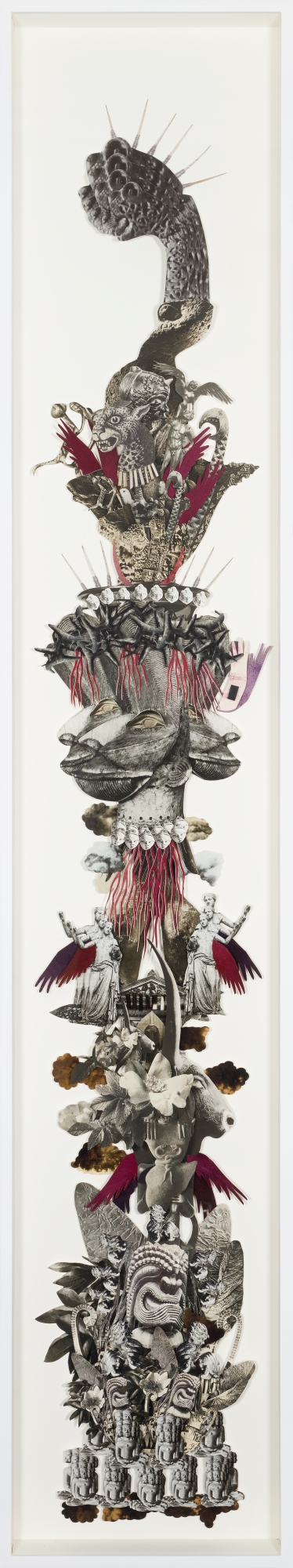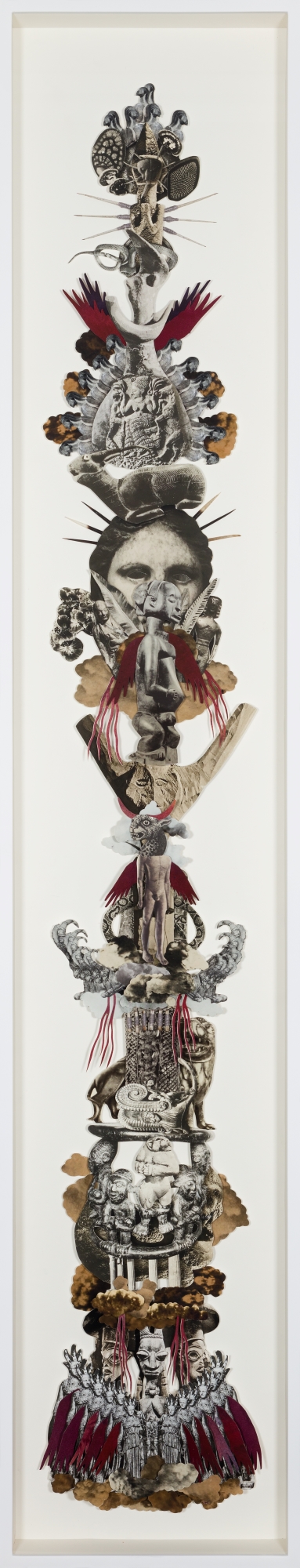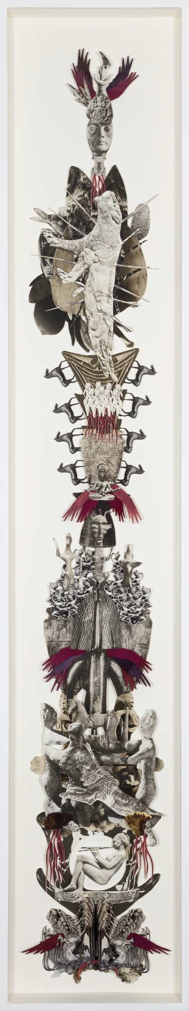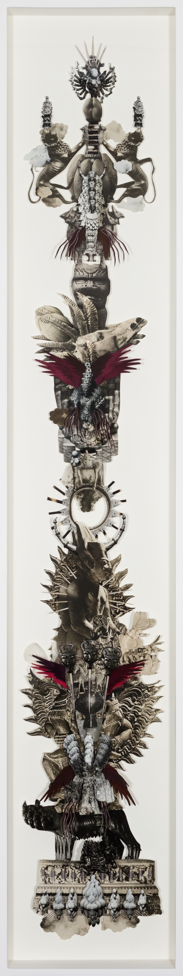 The exhibition consists of built structures and tableaux in which a diversity of cultural traditions co-exist in the form of idiosyncratic hybrids. Miniature photographs offer peepholes into strangely familiar, distant worlds. The montages and videos make reference to the established pillars of Western civilization, but these are dissected and turned on their head. Snippets of text from sacred writings, such as the Egyptian Book of the Dead, the poems of the Sufi mystics, the I Ching, the Emerald Tablet as well as the hymns of Enheduanna (the ancient priestess of Ur), are intermingled with images of the disjecta membra of ancient worlds.