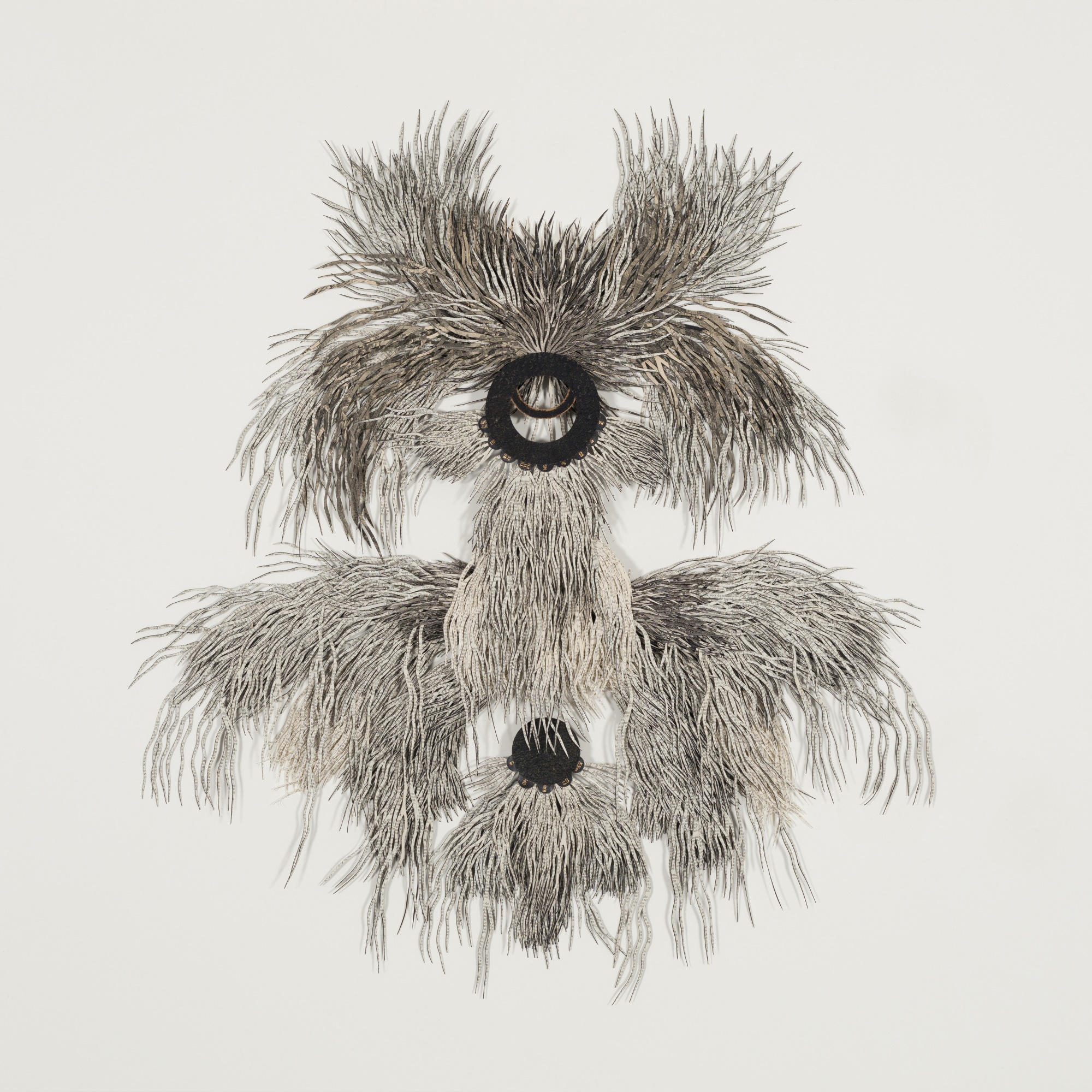 Once upon a time, in a latter-day Babel, a curious artist created her own creation myth, contributing an original answer to the perennial question of how existence came into being. [This] is her version of Genesis, her vision of how it all begins. In a language of her own making, she communicates the ambience without words. As prima materia, she has convened seven books explaining some of the old stories about how we got here. Her genesis story – as is often the case with stories, calendars, templates and temples – is literally built upon seven previous versions. These books, among them the Bible and Darwin’s ‘On the Origin of Species’, were powerful towers broadcasting over space and time, in all languages, their particular message. Academia. Science and Biology. Archaeology and Palaeontology. Philosophy and Ethics. Religion. All pillars of Western civilisation, idols with feet of clay. With her scissors, the artist has cut through these dense and claustrophobic forests of knowledge, these treatises on good and evil, rendering the cacophony of Ages mute. The dogma days are over. But we are not yet out of the woods.